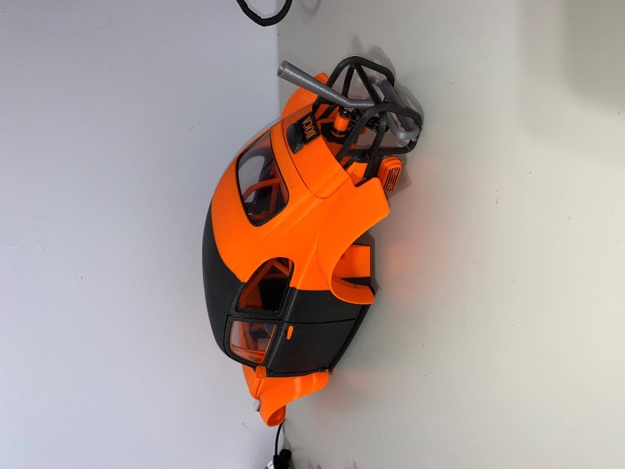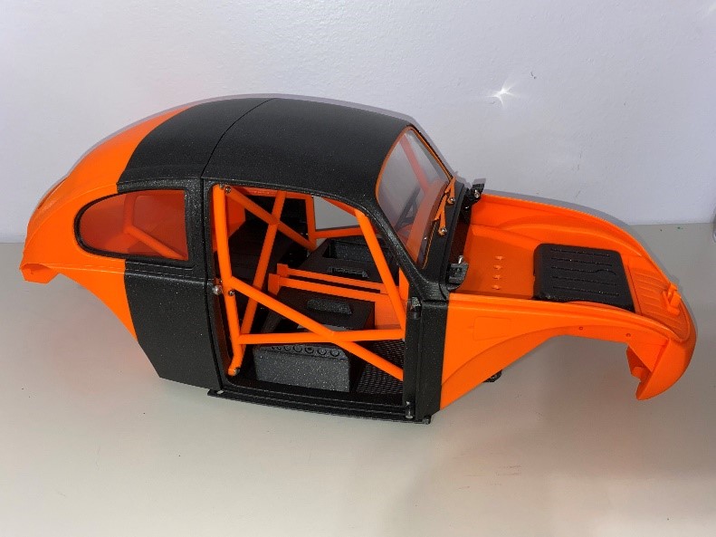 Here are pictures of the completed body before the front and rear axles are installed.  For the window glass I used a clear 1mm plastic binder cover.  I decided to print the front blinkers in clear filament, any other color didn’t look quite right with the orange body color.