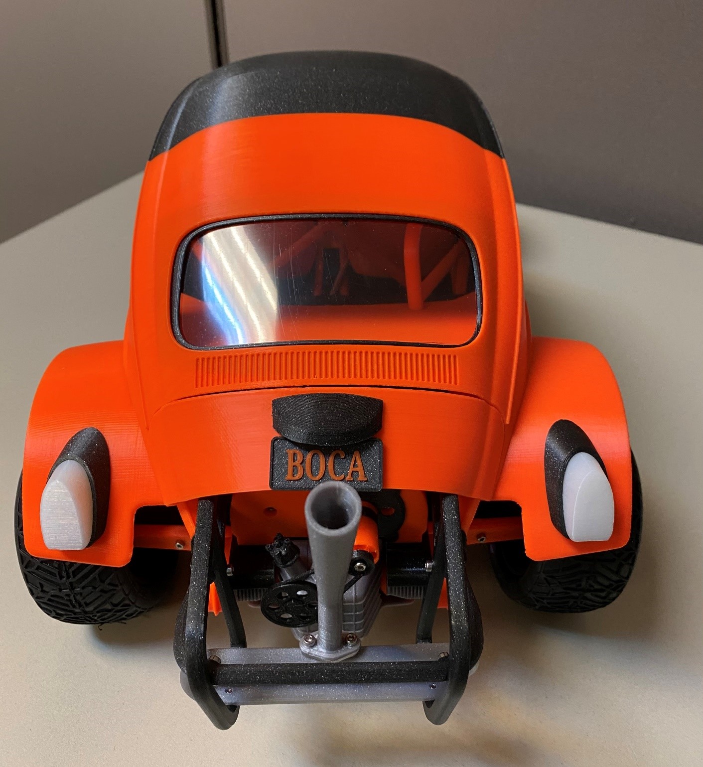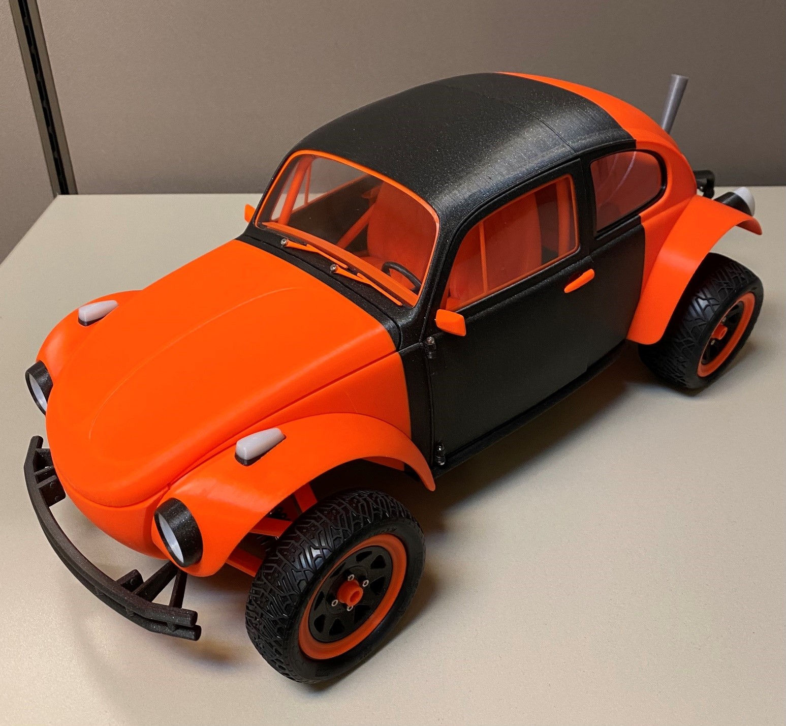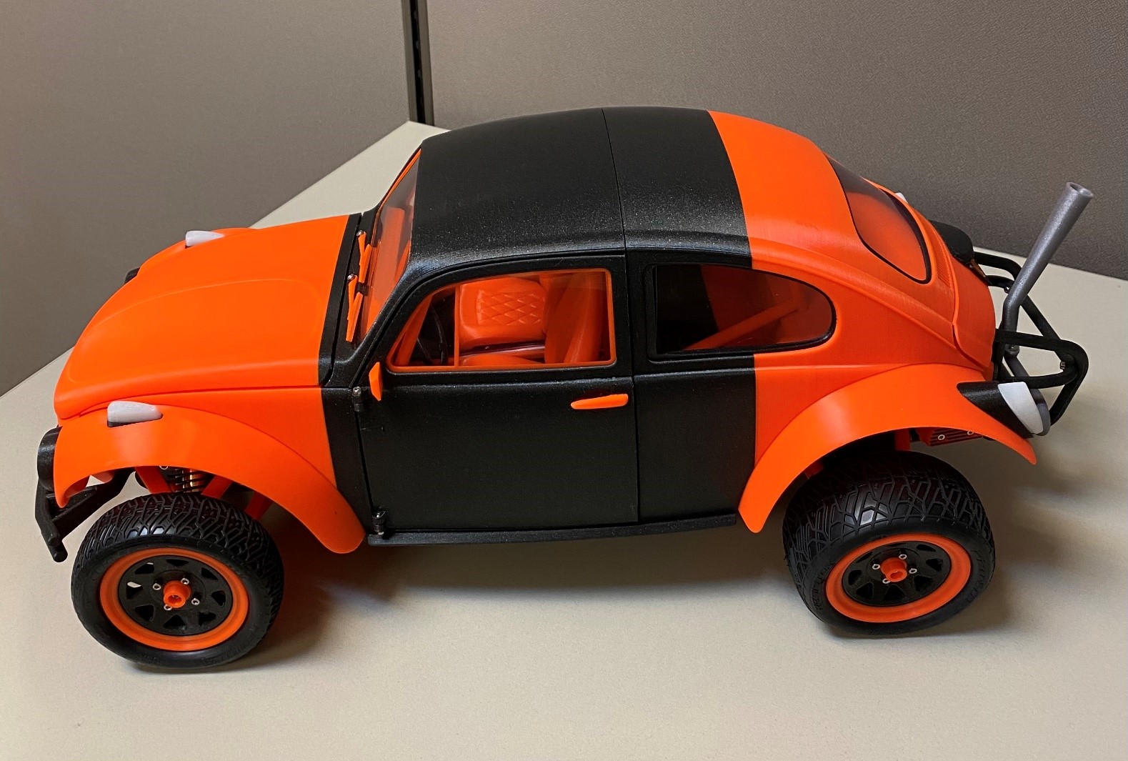 This project is a 3D printed model Volkswagen Beetle.  The download from the 3D Sets website (www.3dsets.com) includes an easy to follow assembly guide and a list of all non-printed parts.  This model requires about 3kg of filament, PLA is recommended.  I used Prusament Orange and Galaxy Black.  You will need more than 300 pcs. of hardware, 13 pcs. 6700-2RS (10x15x4) mm bearings, 1400kv Brushless Motor and Speed Controller, 2S LiPo Battery (5000mah), 1/10th scale buggy tires, Radio and Receiver.  This model is for someone with intermediate or higher level printing skills.  This model will take more than 300 hours of print time and about 20-30 hours of build time.  Having a good tool set with 1.5, 2.0 and 2.5mm Allen Head screw drivers makes the build much faster and easier.  I consider myself an intermediate level 3D printer I have built a few of the other models produced by the 3D Sets group but this model was very different from the others using a belt driven rear axle system.