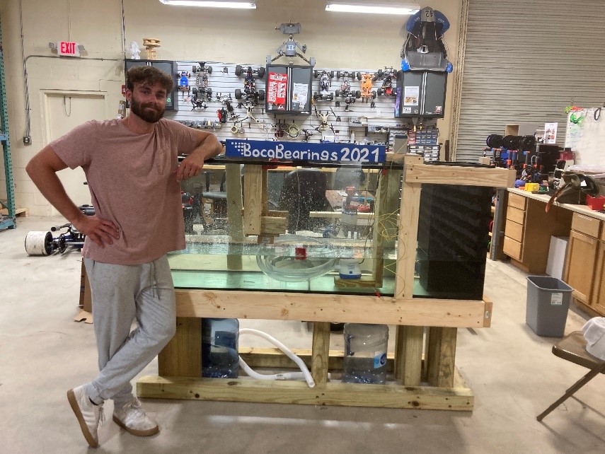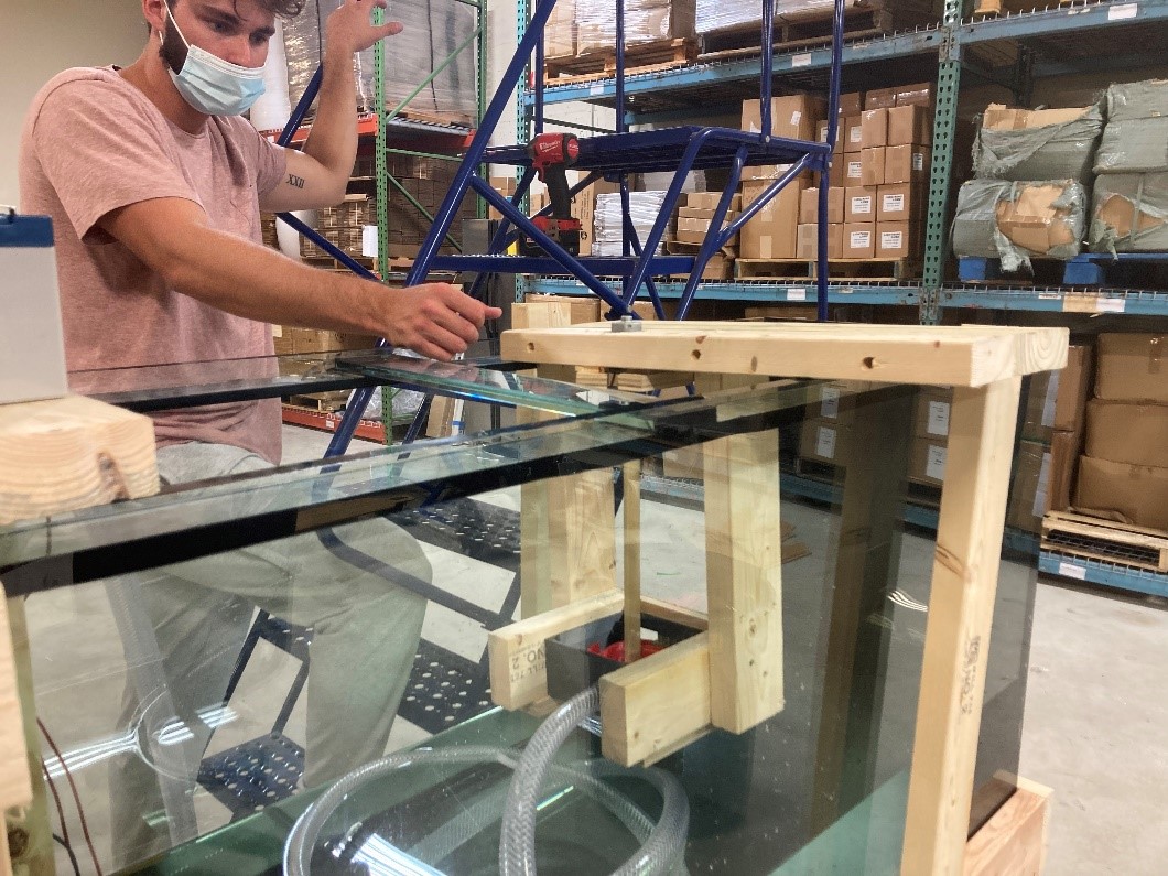 In remedy of this issue, Carmen and Tyler decided to have one bilge pump situated at the bottom of the tank, and the tube leading directly over the turbine. In this, the design idea was to have the water fall back into the tank and then be recirculated by the bilge pump, creating a loop.