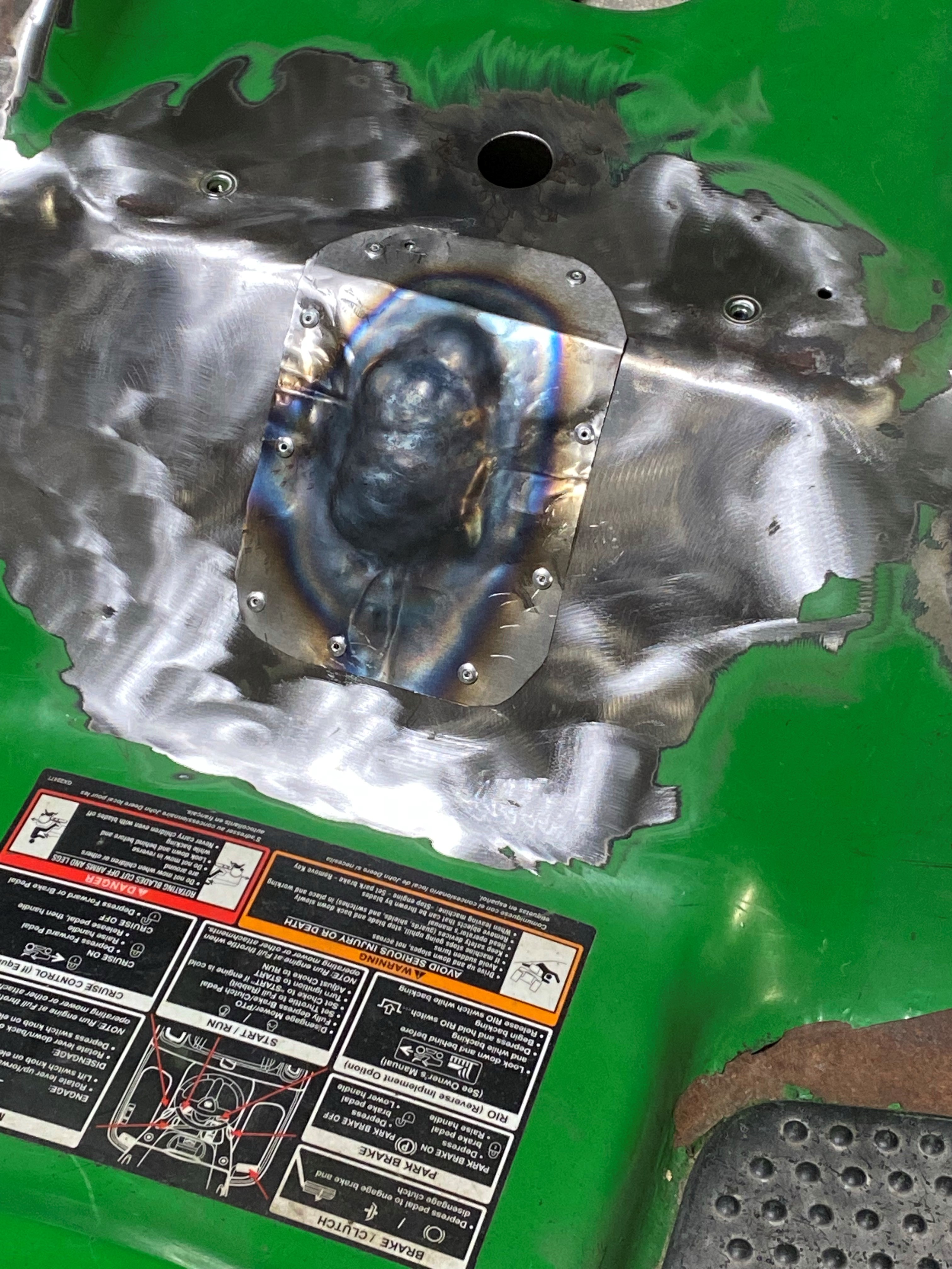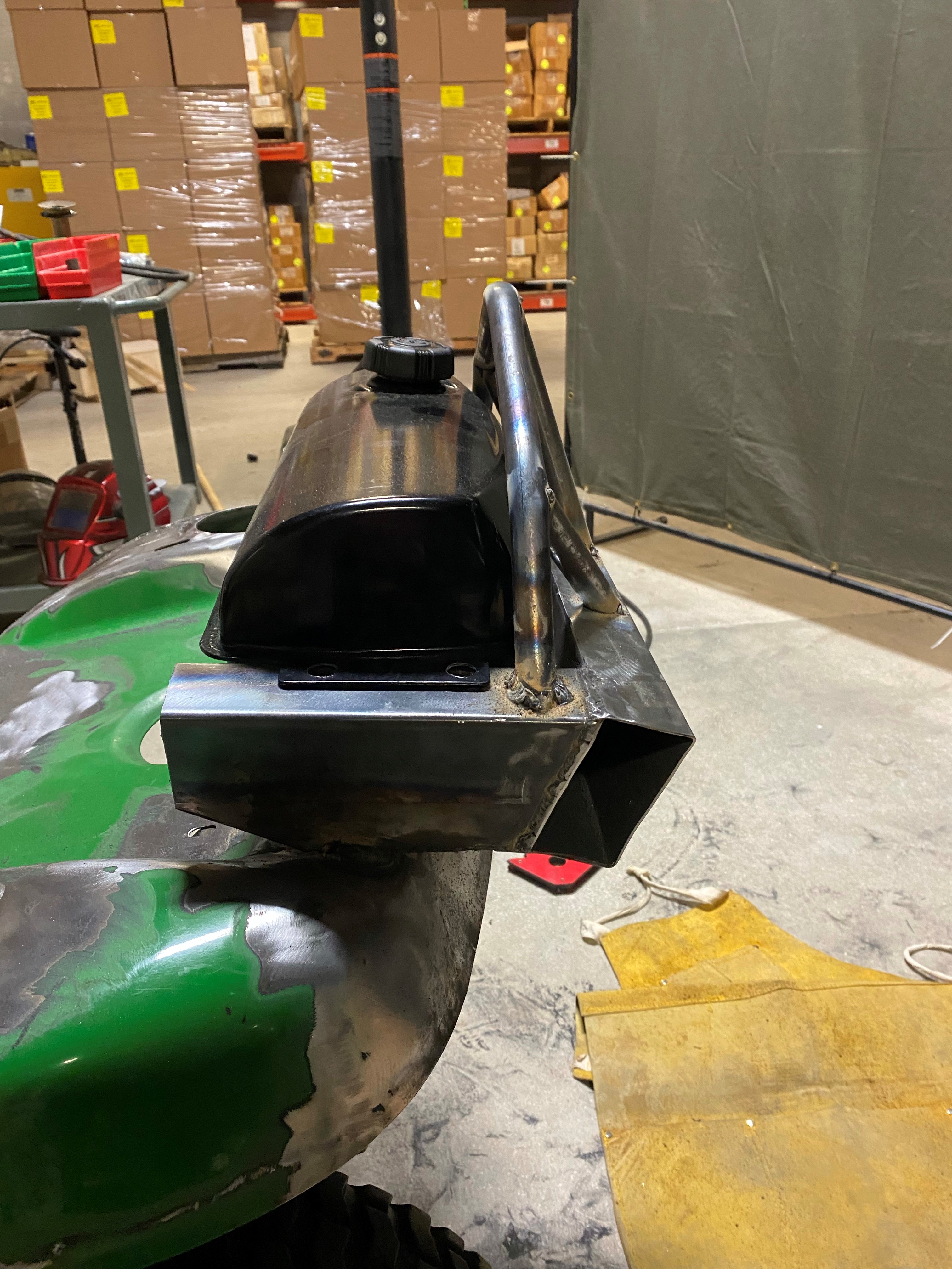 Next due to all the prior modifications there were some issues concerning where the gas tank would be located as the stop one would no longer fit where it was initially. After some thought the decision was made to place the gas tank on the back of the mower with an all new mounting system. To achieve this the paint was stripped off the rear, two pieces of 4in steel tube were cut to size and placed at a distance where there the gas tank would fit between them and then welded into place. Next another piece of that tube was cut and welded across the back to act as a bumper in the event of a collision and then 3/4” round tube was bent and gut tested in such a way to protect the tank from crumpling in the event of a rollover or large object collision. Finally a piece of sheetmetal was welded in on the bottom and sides to prevent and rocks or small debris from popping off the bottom of the tank and to give a cleaner overall look.