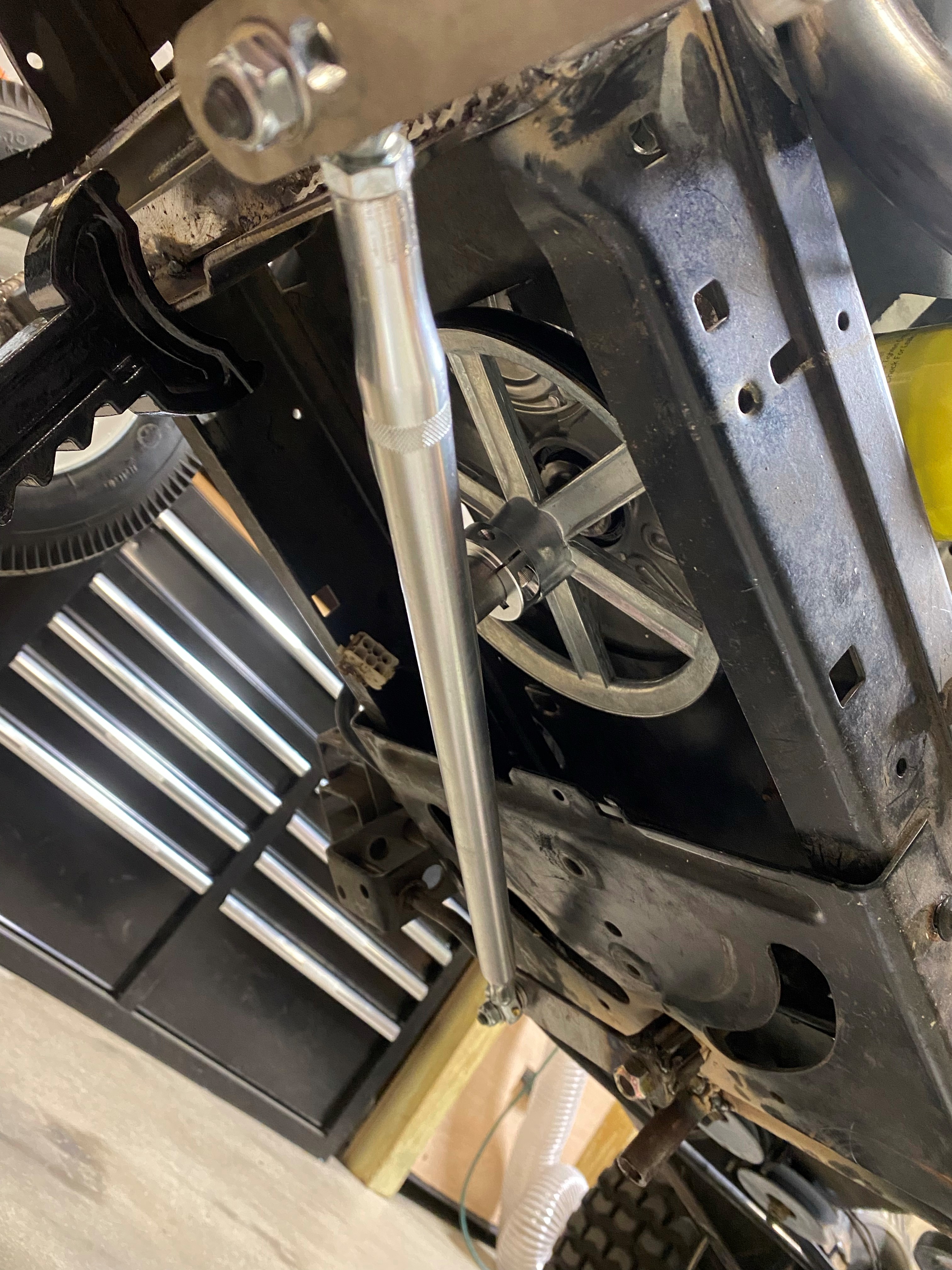 But because of the new higher ride level the belts would no longer line up properly with the mower shaft. To alleviate this problem we installed a jackshaft using our own Boca Bearing pillow block bearings to secure it. This works by using two belts instead of one where the first belt runs from the engine to the pulley on the jackshaft, and the second belt runs from the jackshaft to transaxle completing the transfer of power from the engine to the transaxle. One side effect of this is because two pulleys are used on the jackshaft the gearing can either be increased, decreased or left the safe depending on desired effect. For our use case we geared it in such a way that we should have about a 1:10 gearing ratio where as the original stock ratio was about 1:1 which should translate to something like a max speed around 50-60mph before abounding for the extra engine power