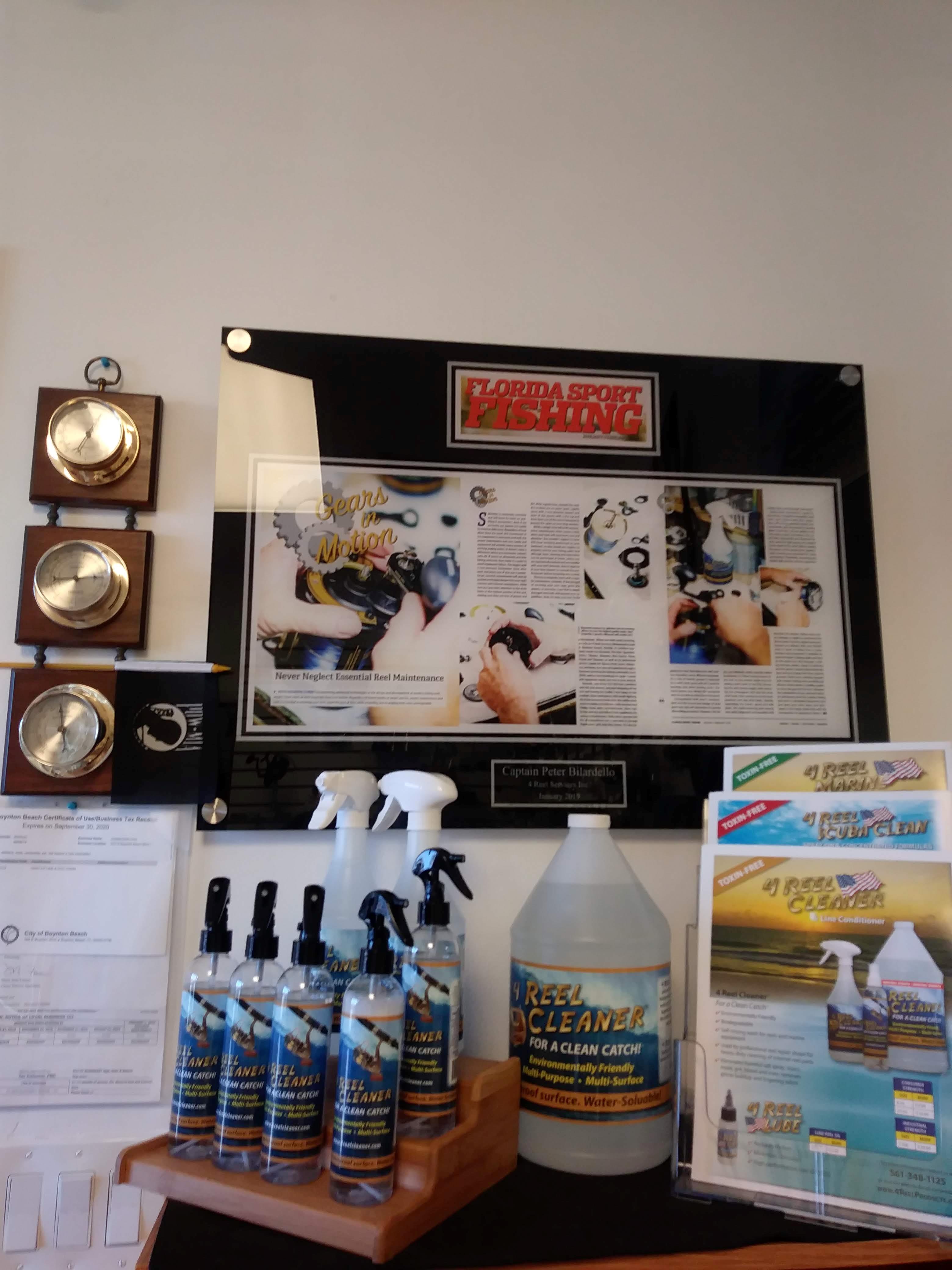 Not only does Peter fix reels but about 5 years ago he developed a multipurpose, multisurface, non-toxic, and environmentally friendly cleaning product that he adaptly named “4 Reel Cleaner”. This product is sold in 8 oz bottles for $9.99 and 24 oz for $16.99. The spray is good for cleaning rods, reels, bearings, scuba gear etc. He gifted me a bottle which I am eager to try on my glass table.