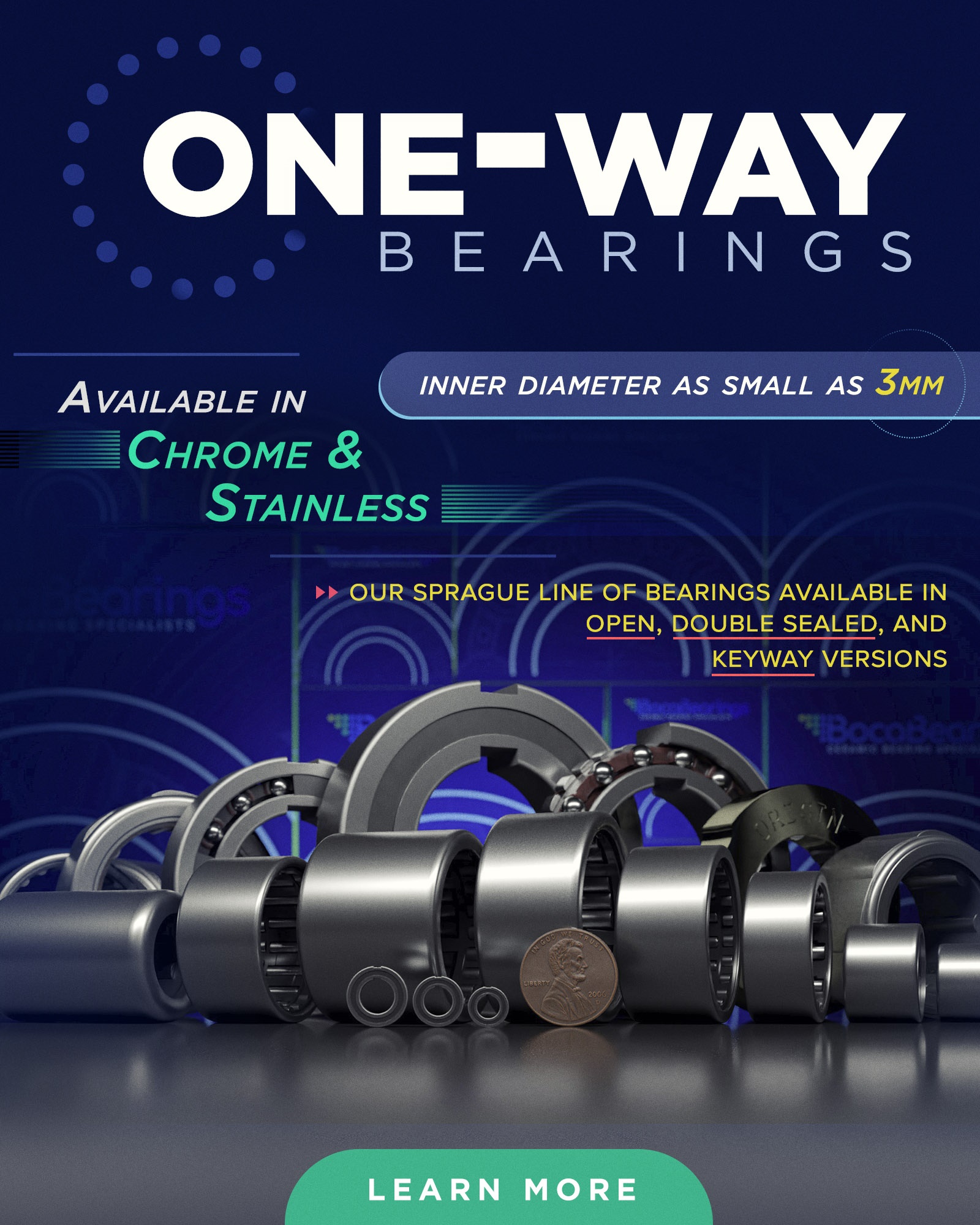 One Way Clutch bearings or Sprag style bearings are constructed from a drawn cup with needle roller clutches and have a small radial section height. They are often called One Way Bearings, Anti-Reverse Bearings and Clutch bearings. The units are compact, lightweight and operate directly on a shaft; they are also suitable for transmitting high torque. Boca Bearings offers Standard and Stainless Steel one way clutch bearings as well as OWC style One Way bearings in standard and stainless steel, EWC Hex one way bearings, and CSK Sprag Type one way bearings available with avaialbe keyway options for higher torque capabilities.